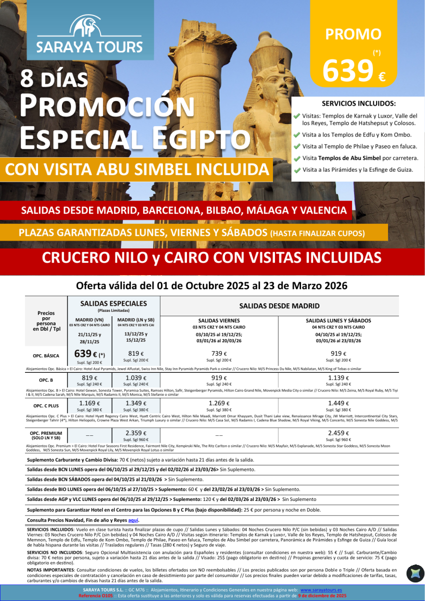 Últimas Plazas Egipto Clásico 8 días. Viernes y Lunes. Crucero y Cairo con Visitas. Desde 549 €