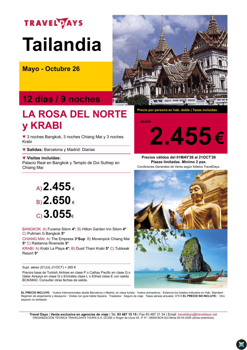 La Rosa del Norte y Krabi - 12 días desde BCN/MAD a partir de 2.455 €